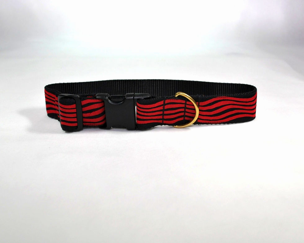 Our wide clip collars are constructed of Jacquard ribbon over flat nylon webbing or seatbelt webbing with a sturdy black plastic side release buckle and metal D ring in a color (brass or nickel/chrome) that compliments the ribbon used. We prefer seatbelt webbing for our wide clip collars because it is lighter weight than flat nylon webbing, yet stronger. It allows us to eliminating excess bulk without sacrificing the necessary strength to restrain your dog.